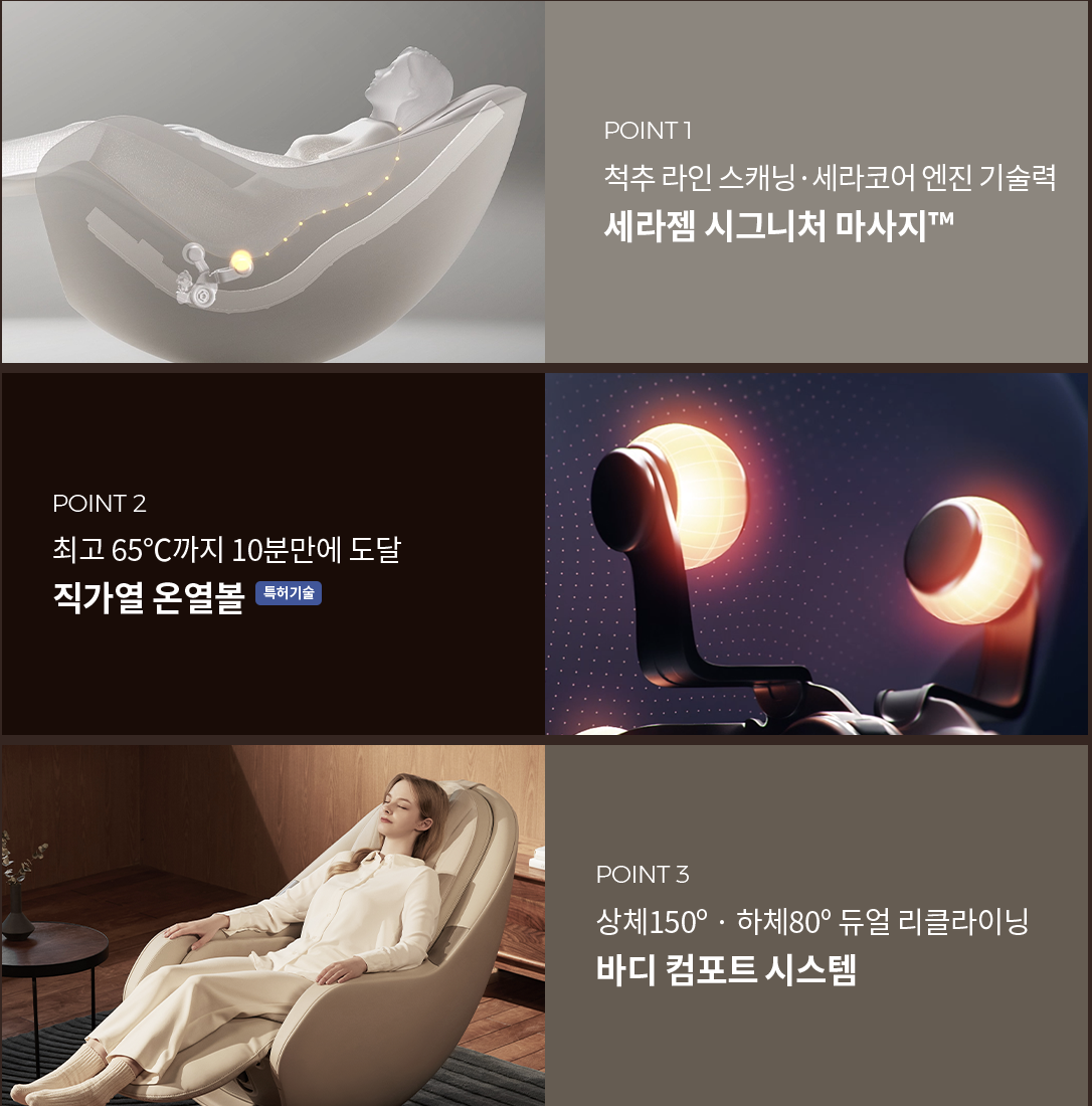 자동 체형 인식 기능은 사용자의 신체 조건에 맞춰 마사지를 조정하며, 무중력 리클라이닝 기능은 하중을 분산시켜 척추에 부담 없이 전신을 편안하게 지지해줍니다. 마사지 방식은 등, 허리, 엉덩이, 종아리 등 주요 부위에 세라믹 온열과 에어백 압력 방식을 결합하여 실질적인 피로 해소 효과를 도모합니다. 특히 발부터 어깨까지 연결되는 일체형 마사지 루트는 중장년층이나 근육 회복이 필요한 사용자에게 유리하게 작용합니다.
